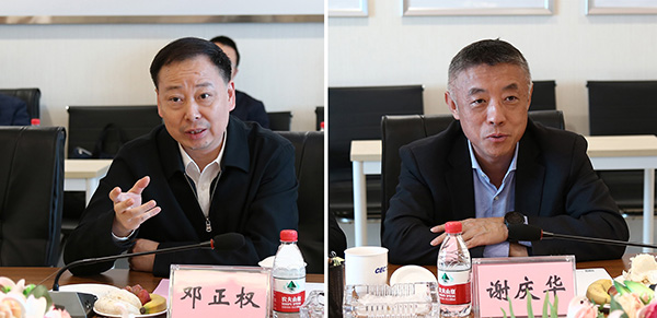 遂寧市市長鄧正權(quán)、中電科技董事長謝慶華在座談會(huì)上探討交流